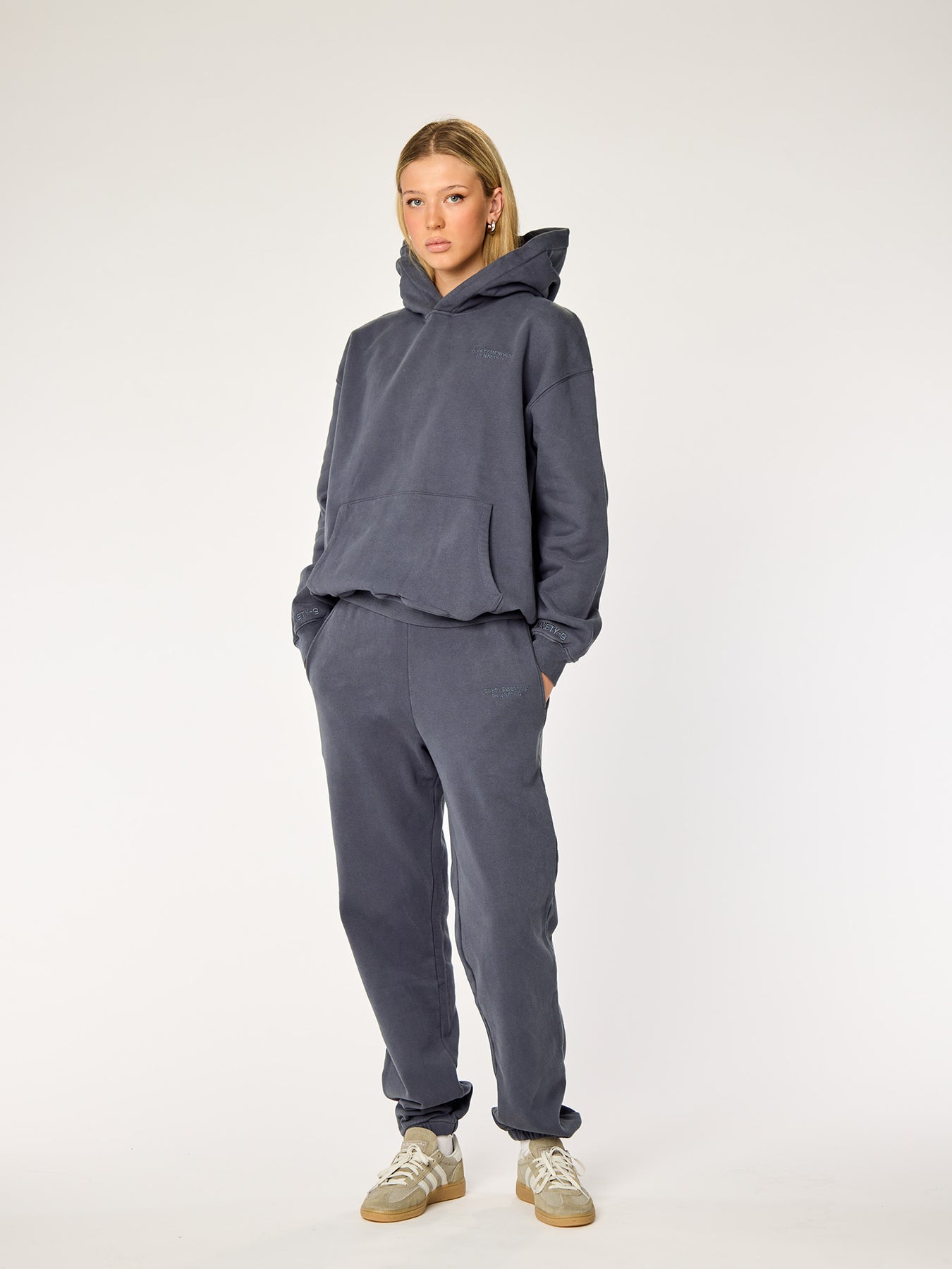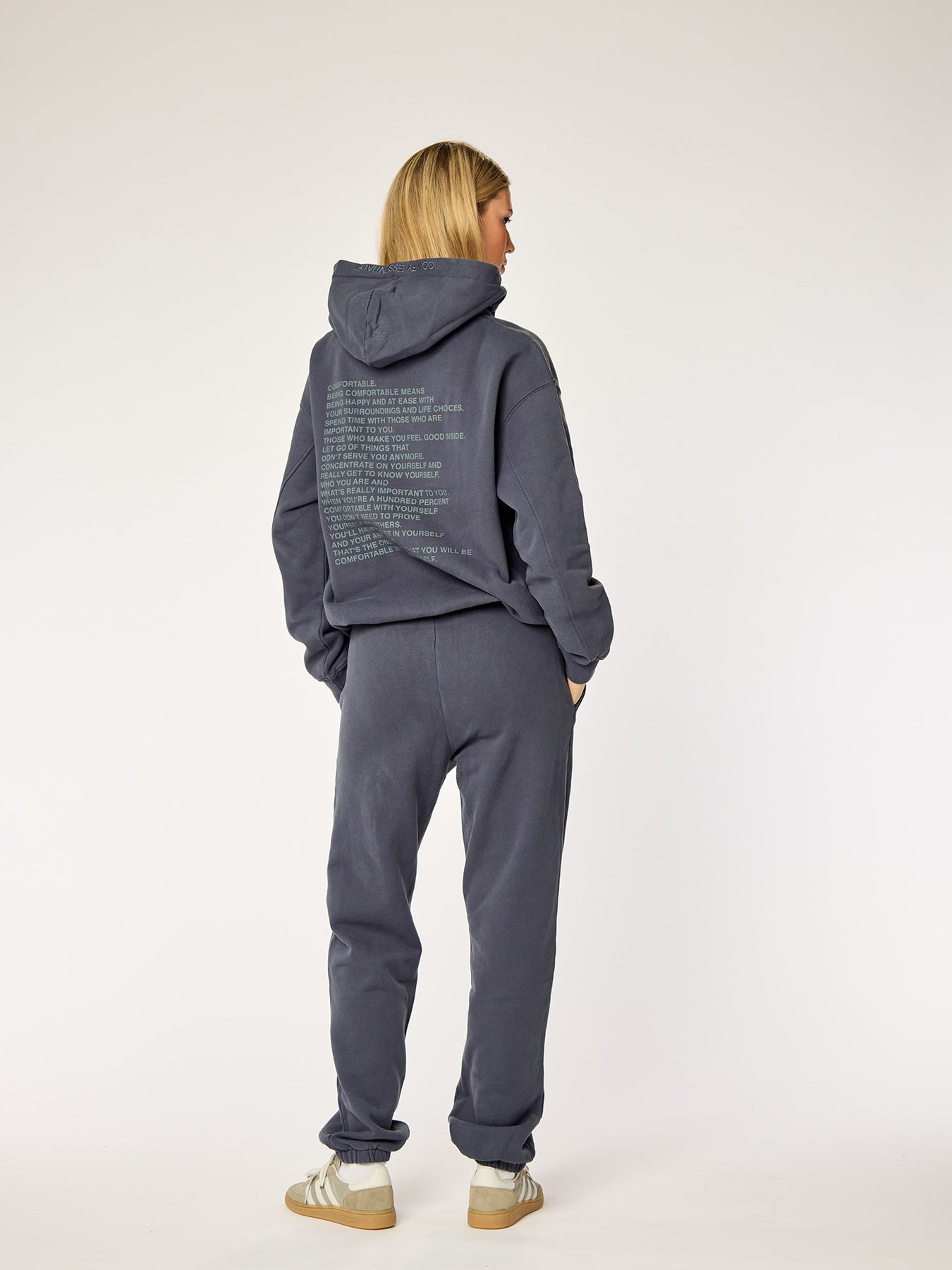 Unsere Essentials Sweatpants sind etwas oversized, aber nicht zu sehr, um die perfekte Passform zu schaffen. Sie haben Schnüre im Inneren des Bundes, sodass Sie die Sweatpants anpassen können, ohne dass Schnüre außen sichtbar sind, und sie sind schön an den Knöcheln gesäumt.